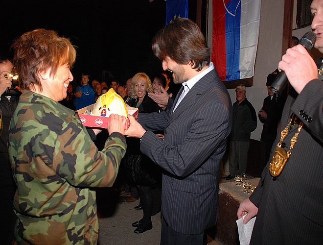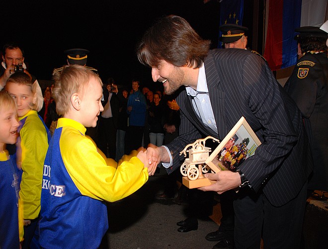 A ako spomienku na dnešné stretnutie vážený pán podpredseda vlády SR nám dovoľte odovzdať Vám nasledovné upomienkové predmety, tortu v tvare prilby, spoločnú pamätnú fotografiu zo súťaže z Trenčína a drevennú repliku historickej rakovickej striekačky z r. 1876.